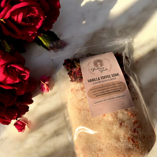 Step into your prepared bath and let the warm water and rich vanilla toffee scent envelop you. Soak for at least 20 minutes to allow the Epsom and Himalayan salts to work their magic, easing muscle tension and melting away stress.