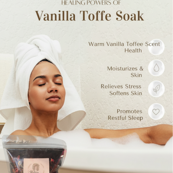 Slip into the warm embrace. Let the Epsom and Himalayan salts work their wonders, melting away stress and easing tired muscles. Close your eyes, breathe deep, and let the vanilla toffee scent transport you. Emerge feeling refreshed, renewed, and utterly relaxed. Your holistic wellness ritual is complete.