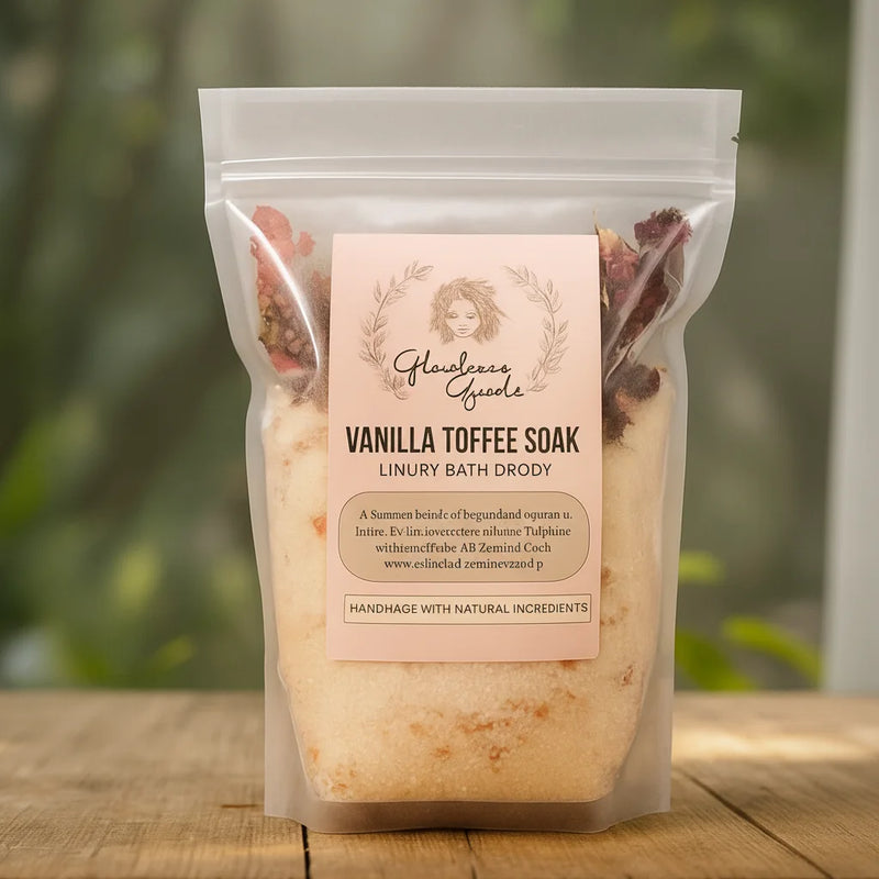 Scoop 1/2 to 1 cup of Glowberry Vanilla Toffee Soak into the water. Watch as the natural salts and botanicals dissolve, releasing that sweet, comforting vanilla toffee aroma. Feel the goodness activate, ready to soothe your muscles and calm your mind.