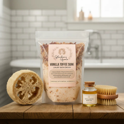 Add a generous scoop (or two, we won't tell!) of Glowberry Vanilla Toffee Soak to your water. Watch as the natural salts and botanicals dissolve, releasing their soothing aroma. Step in, breathe deep, and let the warm embrace melt away tension. Feel your body surrender.