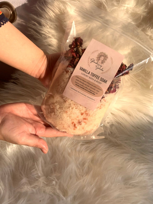 Drench your senses in Glowberry Vanilla Toffee Soak. Crafted with epsom and himalayan salts, plus real botanicals, it's your natural escape for stress relief, muscle comfort, and deep sleep. Pure self-care, from nature to you.